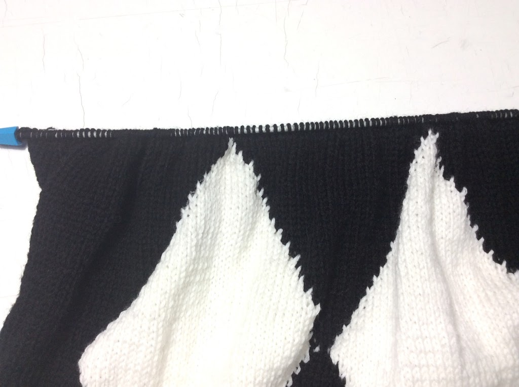 When you arrive at a single stitch of the white rhombuses (after working the iron in reverse), proceed differently: one more row is knitted with the same colors as the previous one, the next row is purled all black stitches are worked while continuing to cross the threads when changing, the iron after (work straight) the white starts to increase again.